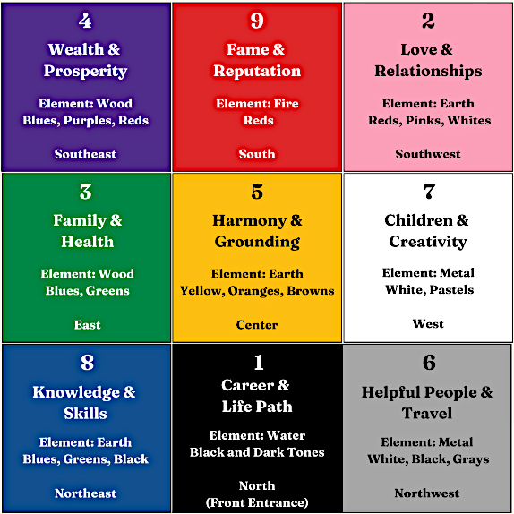 Each of these areas of the Bagua Map represents a particular area of your life, and each has a corresponding shape, color, season, number, and element.